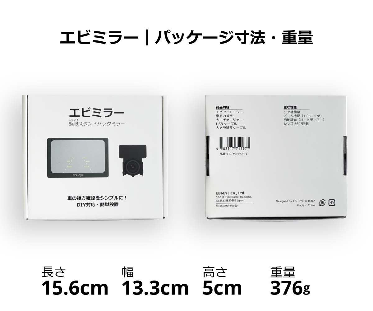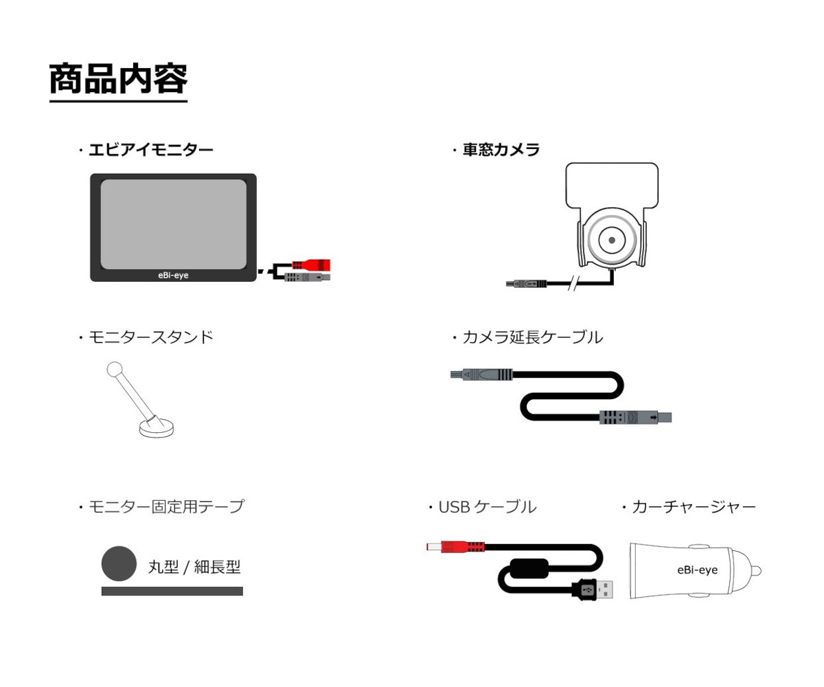 車窓カメラ x1/モニター x1/カーチャージャー x1/USBケーブル x1/カメラ延長ケーブル x1/モニタースタンド x1及びモニター固定テープ類